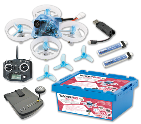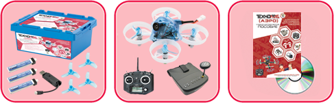 Набор состоит из большого количества безопасных FPV квадрокоптеров, полноценного набора гоночной трассы, автоматической системы подсчета времени, методического пособия по практике управления дронами и массы важных для обучению полётам вещей.